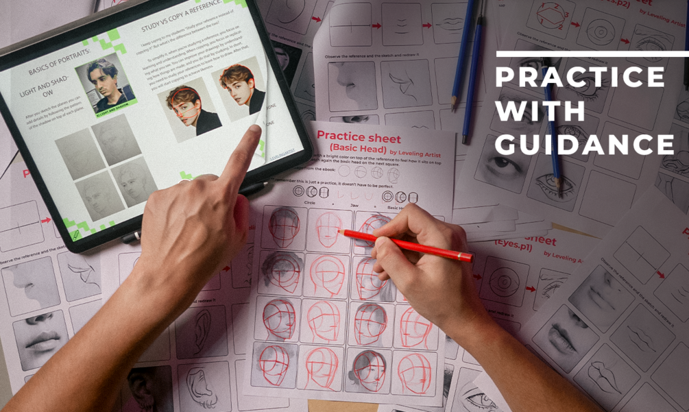 In this bundle you will have access to a portrait guide as well as 9 exercise sheets to practice. Covering how to draw the head, the eyes, the nose, the mouth and the ears.